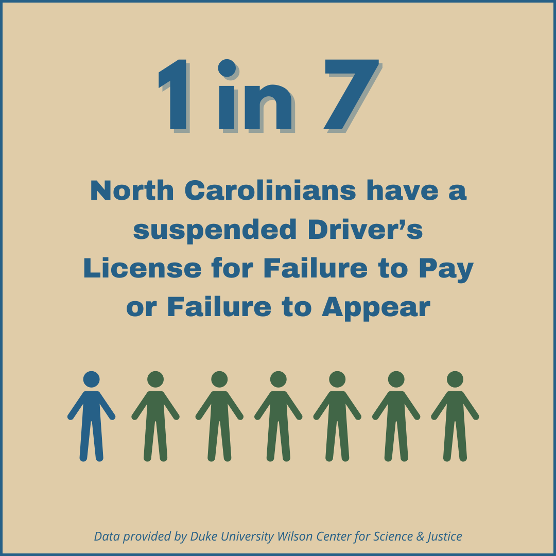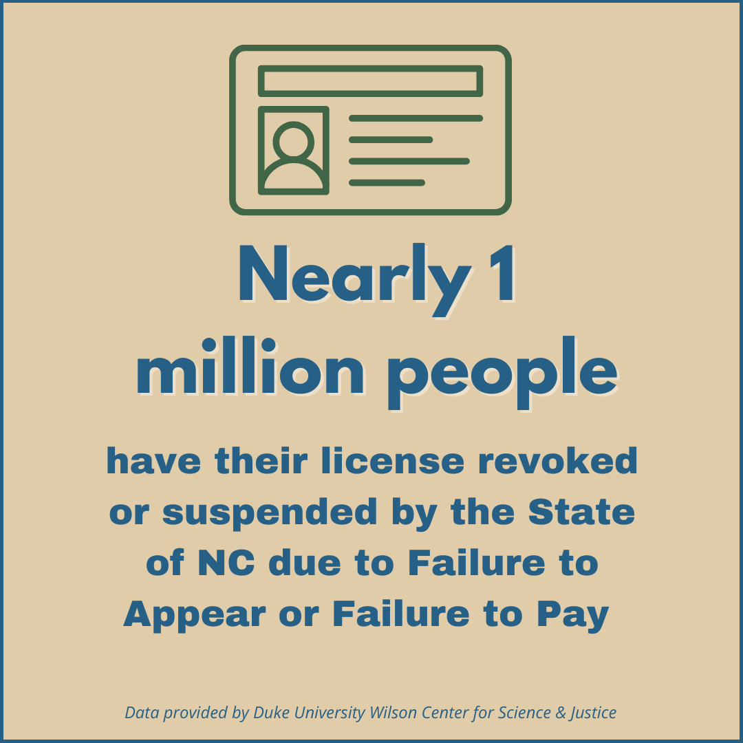 There are more than 700,000 people in NC, mostly people of color, who face barriers to opportunity because their driver’s licenses are indefinitely suspended, simply because of unpaid traffic-related fines and fees.